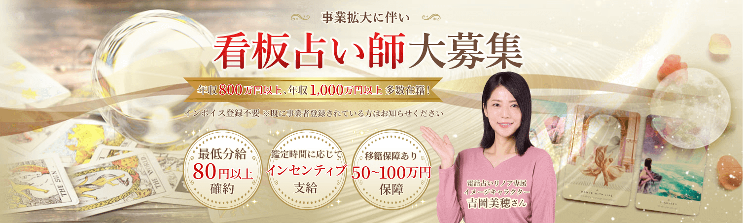 現在在籍されている電話占い会社様での収入に応じて、月々の報酬額を3ヵ月間保障。分給につきましても、現在の収入額に応じて保障を致します。今所属されている電話占い会社様からの移籍をご検討されている方は、後述の移籍保障制度をご確認くださいませ。